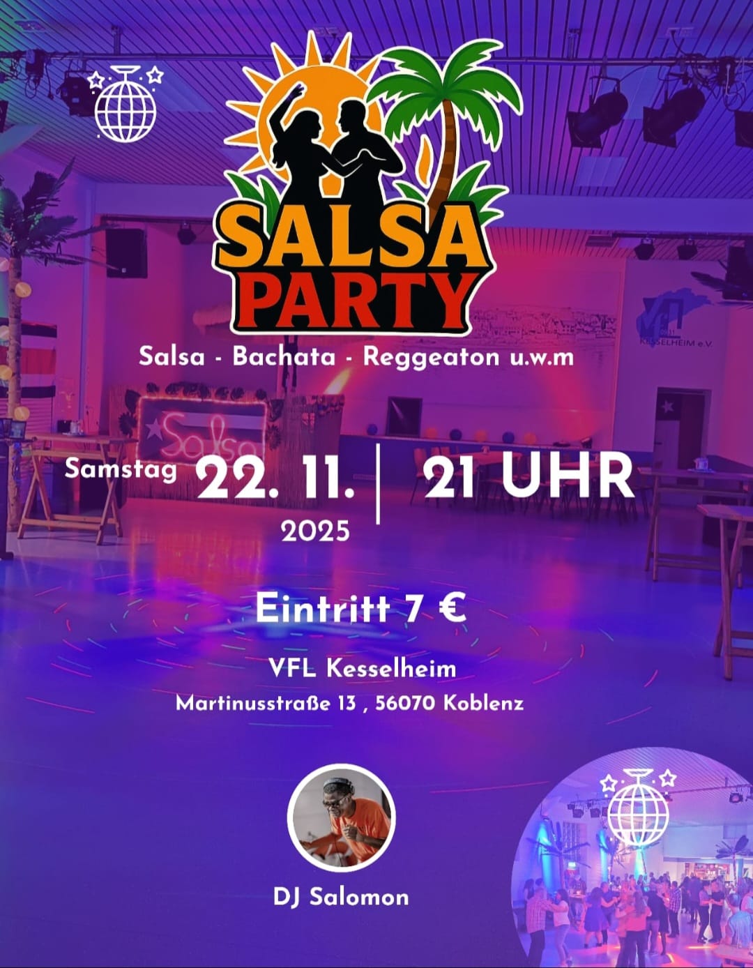Am Samstag, den 22. November 2025, ist es wieder soweit: Die heißeste Salsa-, Bachata- & Reggaeton-Nacht der Region steigt im VFL Kesselheim! 🔥 🎶 DJ Salomon sorgt für die besten Latin-Beats und eine unvergessliche Stimmung auf der Tanzfläche.🌴 Ob Anfänger oder Profi – jeder ist willkommen, der Lust auf gute Musik, rhythmische Moves und positive Vibes hat! 📍 Ort: VFL Kesselheim, Martinusstraße 13, 56070 Koblenz🕘 Einlass: ab 21:00 Uhr💸 Eintritt: 7 € ✨ Bring deine
